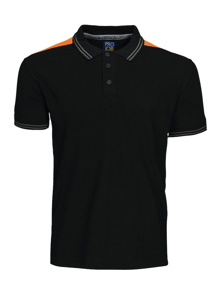 Lyhythihainen pikeepaita. Kaulus ja hihansuut joustinneulosta. Napituslistassa kolme nappia. Olkapäillä fluoresoivaa kangasta.