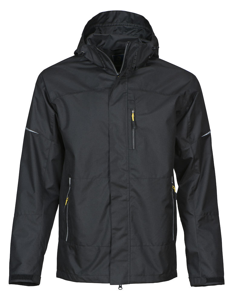 Kevyt takki, jossa heijastavia yksityiskohtia ja irrotettava huppu. Materiaali on tuulen- ja vedenpitävää. Yksi rintatasku ja kaksi vetoketjullista erikokoista sisätaskua joista.