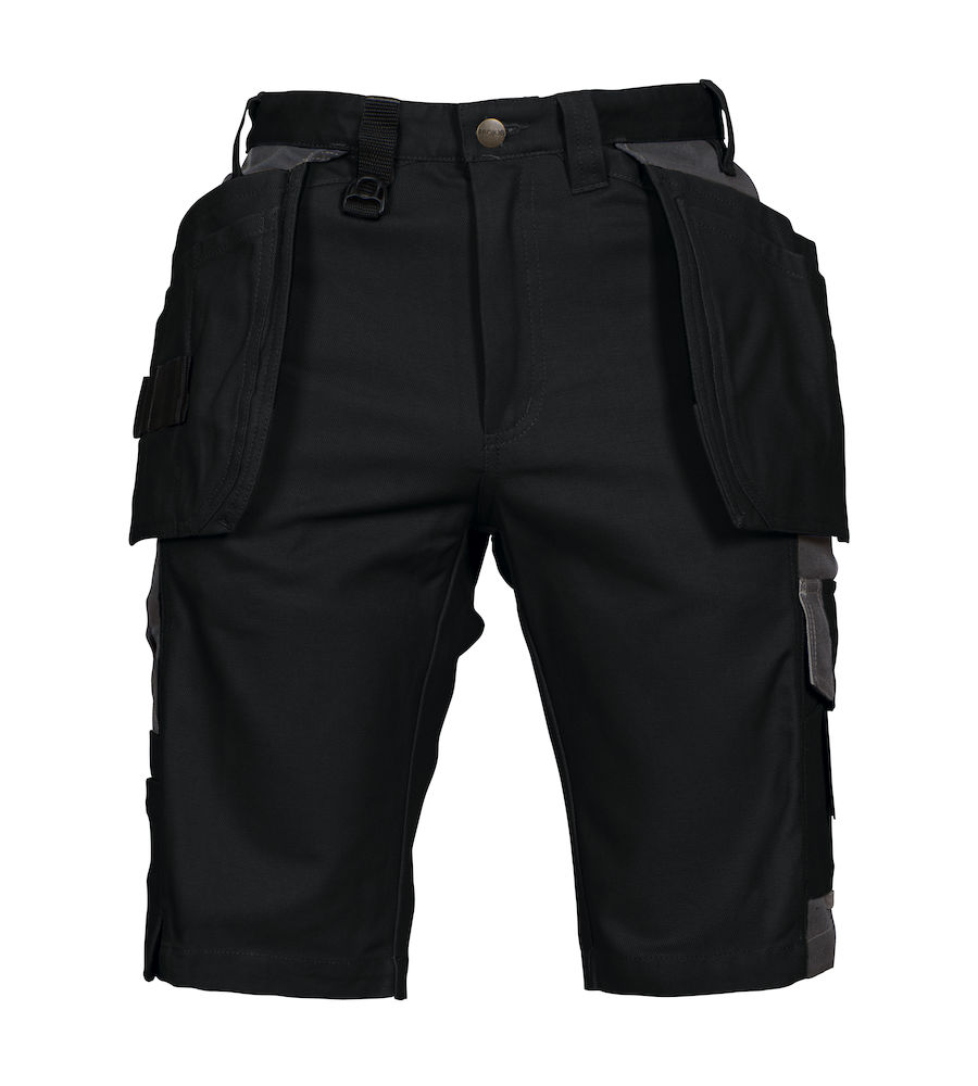Shotsit kestävästä polyesteristä. Reisissä on lisävahvikkena kaksinkertainen kangas. Kaksi riipputaskua, jotka voidaan työntää sivutaskuihin. Toisessa riipputaskussa on lisätasku ja toisessa työkalulenkkejä. Syvät sivutaskut, joissa tilaa naulataskuille. Reisitaskussa paikat puhelimelle, kynälle ja työkaluille. Kaksi säädettävää vasaralenkkiä ja kaksi D-rengasta. Mittatasku, jossa työkalutasku ja puukkonappi. Taka- ja reisitaskuissa on lenkit Inbag-taskuille.