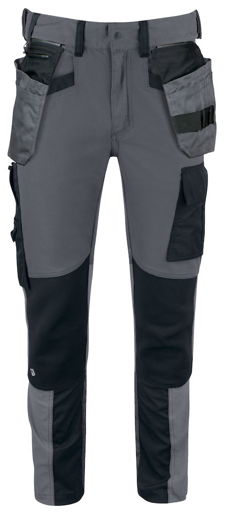 Joustavat työhousut mahdollistavat hyvän liikkuvuuden ja tuntuvat mukavilta päällä. Moderni leikkaus. Neljään suuntaan joustavaa materiaalia reisissä ja takamuksessa. Kahteen suuntaan joustavaa materiaalia polvitaipeissa ja lahkeiden alaosassa. Sivuissa vetoketjulliset tuuletusaukot. Myös vyötäröllä tuuletusaukko. Housuissa on reisitaskut, vasemmalla tasku työkaluille ja kynille, puhelintasku, jossa tarrakiinnitys, ja ID-korttipidike. Oikealla mittatasku ja puukkotasku, jossa puukkonappi. Kaksi vasaralenkkiä. Irrotettavissa riipputaskuissa ProJobin kehittämä piilokiinnitys. Mahdollisuus kiinnittää MOLLE-järjestelmä molemmille sivuille. Heijastavat yksityiskohdat parantavat näkyvyyttä. Säädettävät lahkeensuut. Muotoillut polvet. Sisäpuolella polvisuojataskut, jotka voidaan säätää kahdelle eri korkeudelle. Riipputaskuissa ja lahkeissa Cordura®-vahvikkeet ja polvissa joustavat kevlar-vahvikkeet, jotka lisäävät housujen kestävyyttä ja mukavuutta.