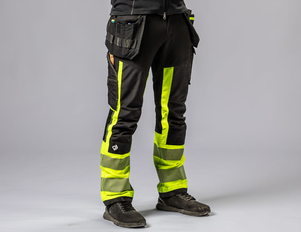 Joustavat työhousut mahdollistavat hyvän liikkuvuuden ja tuntuvat mukavilta päällä. Moderni istuvuus. Tilavat reisitaskut molemmin puolin. Vasemmalla tasku työkaluille ja kynille, puhelintasku, jossa tarrakiinnitys, ja ID-korttipidike. Oikealla mittatasku ja tasku työkaluille, jossa puukkonappi. Muotoillut polvet. Sisäpuolella polvisuojataskut, jotka voidaan säätää kahdelle eri korkeudelle. Heijastavat yksityiskohdat.