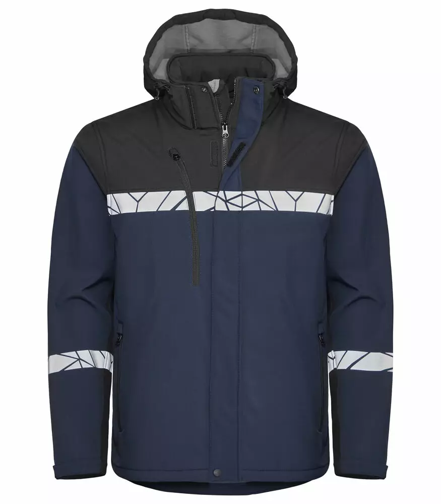 Tekninen takki tuulta ja vettä hylkivästä softshell-materiaalista. Edessä vetovetju, jossa tuulelta ja vedeltä suojaava lista. Oikealla puolella rintatasku, jonka sisällä ID-korttipidike. Vetoketjulliset sivutaskut. Avoimet sisätaskut. Pidennetty selkäosa. Irrotettava ja säädettävä huppu. Säädettävät hihansuut tarranauhalla ja säädettävä vyötärö kiristysnyörillä. Mikrosiru vasemmassa sisäsaumassa.
