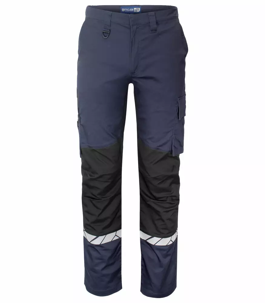 Huoltohousut, joissa avoimet sivu- ja takataskut. Reisitaskut molemmilla puolilla. Vasemmalla puolella tilava läpällinen tasku, yksi sisäinen puhelintasku ja ID-korttipidike. Oikealla tasku työkaluille, jossa puukkonappi. Muotoillut polvet, joustavaa kangasta haaroissa ja vyötäröllä mukavuuden lisäämiseksi. Takana leveämpi vyölenkki, joka estää vyön painamisen. Piilotasku edessä. Mikrosiru vasemmassa sisäsaumassa.